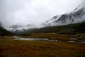 从园区门口骑马到冲古寺有5公里多,沿途都是上山道,但还比较宽,骑马在这林中到上走也别有一番风味因为是雨夹雪的天气,骑马上去后,手脚都冻木了;到了冲古寺下马,我徒步1.7公里到园区电瓶车站,坐80元的电瓶车到珞绒牛场,珞绒牛场三面雪山环绕(北峰观世音菩萨仙乃日(海拔6023米),南峰文殊菩萨央迈勇(海拔5958米),东峰金刚手菩萨夏洛多吉(海拔5958米)),是一处天然的高山牧场和草地,这里是进入牛奶海与五色海的必经之地,由于体力和时间(下午3点要回稻城),我没有进牛奶海和五色海(进去来回要6小时),我在这里拍了一些高山草地风光、深秋河床,这些河床的白色粉末,像雪一样,我开始认为是打霜了,到跟前一看才知是一些白色的沉淀物,成分不知道;在牛场,我一直沿山路向前,越靠近雪山。路越难走,草地上一踩,水往上冒,泥水深一脚,浅一脚;我只好回来,在牛场的休息处,碰到通行的莉莉,等一下又遇上老胡等二人,大家一起坐电瓶车回到冲古寺。